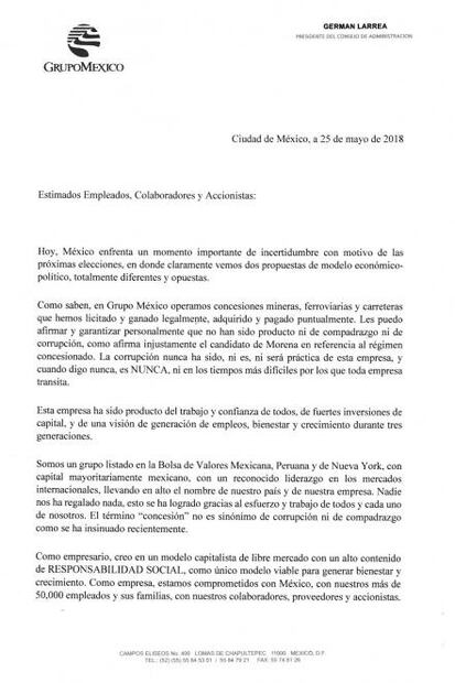 En la misiva de tres páginas y fechada el 25 de mayo, Larrea explica que el modelo económico “afectaría el desarrollo y bienestar del país, de la economía familiar y de las empresas mexicanas. Si este modelo económico populista, en donde todo supuestamente pertenece y proviene del Estado y en el que se ofrece regalar sin trabajar, se llegara a imponer en México, se desincentivarían inversiones afectando gravemente a los empleos y a la economía, se devaluaría la moneda y se provocarían fuertes alzas de precios”.