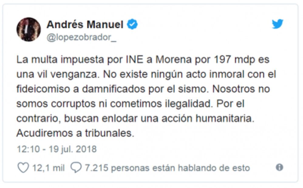 El virtual presidente electo, Andrés Manuel López Obrador, consideró como una “vil venganza” la multa de 197 millones de pesos impuesta por el Instituto Nacional Electoral a Morena por el probable desvío de recursos mediante el uso de fideicomiso para los damnificados de los sismos de septiembre de 2017.