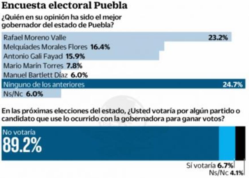 De acuerdo con las mediciones, Eduardo Rivera tendría mejores posibilidades de enfrentarse a Morena que el resto de los precandidatos panistas: Genoveva Huerta, Luis Banck, Gerardo Islas, Humberto Aguilar y Luis Ernesto Derbez. En cualquier caso, el PRI sería relegado al tercer sitio de las preferencias.