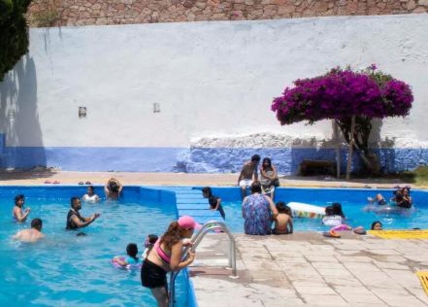 La mayoría de los asistentes permanece en la alberca. Nadan de un lado a otro, juegan con sus amigos o familiares dentro de la alberca, flanqueada por bardas de cantera roja, de los cerros aledaños a La Cañada.