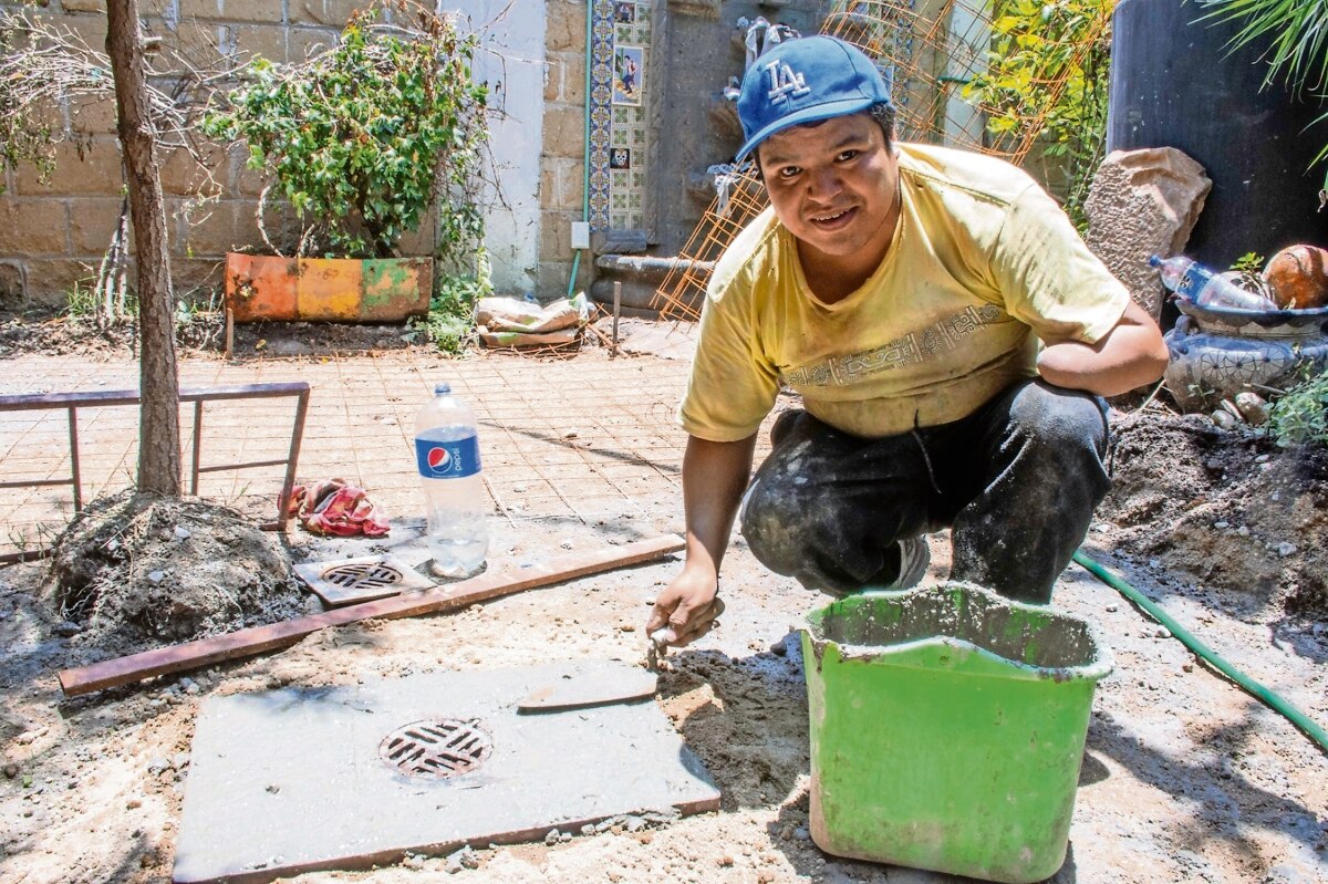 Miguel García López toma el bote mezcla y lo lleva hasta donde está haciendo un piso firme en una vivienda. Dice que pese a tener amputación de la mano izquierda desde los 15 años, ésta no ha sido limitante para trabajar en la construcción, siendo un ejemplo de perseverancia.
