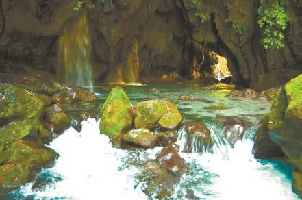 Pasan 40 minutos y, tras caminar en veredas, usar puentes para ir de un lado a otro del río y atravesar dos pequeñas cavernas, llegamos al final: Puente de Dios. Sus regaderas son grandes, el sonido de la caída del agua inunda el lugar combinado con el canto de las aves. Hay caras de asombro al ver este tesoro natural. No se permite ir más arriba, donde está el nacimiento del río, a los manantiales, y es que si la gente llegara hasta ese punto, quizá este paraíso dejaría de existir.