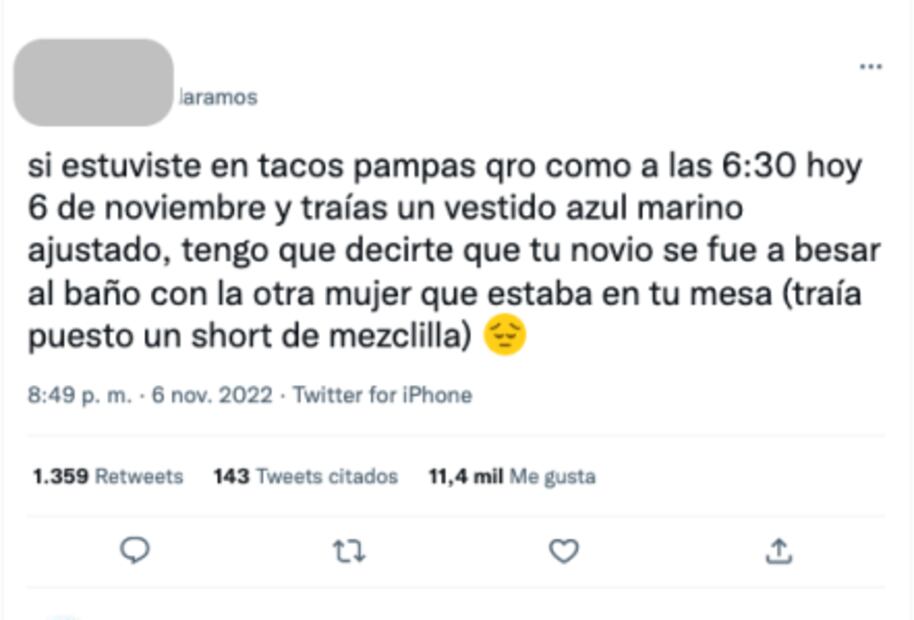 "Si estuviste en Tacos Pampas Querétaro, como a las 6:30, hoy 6 de noviembre, y traías un vestido azul marino, ajustado, tengo que decirte que...", es parte del mensaje publicado en la red social.