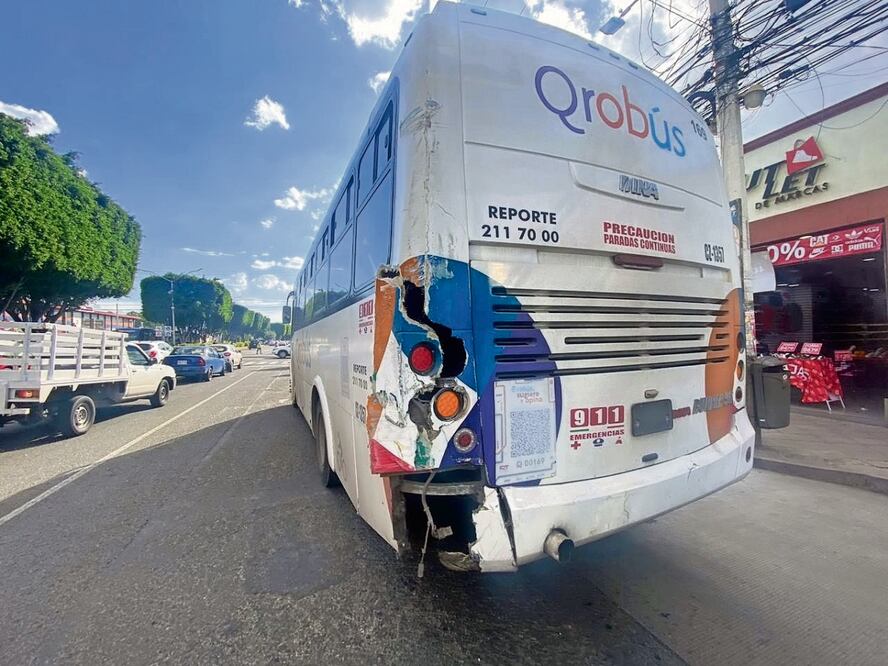 Una unidad del sistema de transporte público Qrobús ocasionó un choque en avenida Zaragoza al querer ganar el paso a otro camión.