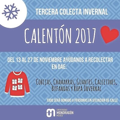 Arrancaron las campañas de Calentón y Colecta Mágica 2017 en la Universidad Mondragón, mediante las cuales se recolectarán cobijas, ropa invernal nueva o en buen estado, así como juguetes.