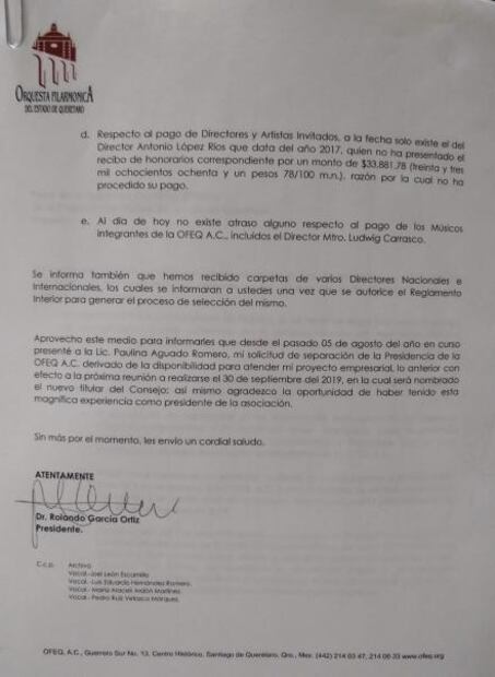 El nombramiento de Armando Arvizu como Gerente General Administrativo, apenas el pasado 4 de septiembre, (cuando Aguado Romero mencionó en la entrevista de ayer que ya llevaba varias semanas en el puesto). También menciona la misiva que están en trámite los cambios para que se reconozca a la OFEQ como donataria. En un tercer punto se habla que desde el año 2017 se trabaja en la regularización de las finanzas de la Filarmónica, con apoyo del Poder Ejecutivo del Estado de Querétaro. En otro inciso refiere que no existe atraso alguno en el pago de los músicos. Además, la carta explica que apenas se han recibido varias carpetas de directores de orquesta, tanto nacionales como internacionales, (información que la titular de la Secretaría de Cultura ya había revelado con anterioridad a la prensa), dichos datos se entregarán a los músicos para generar el proceso de selección del próximo director titular de la OFEQ.