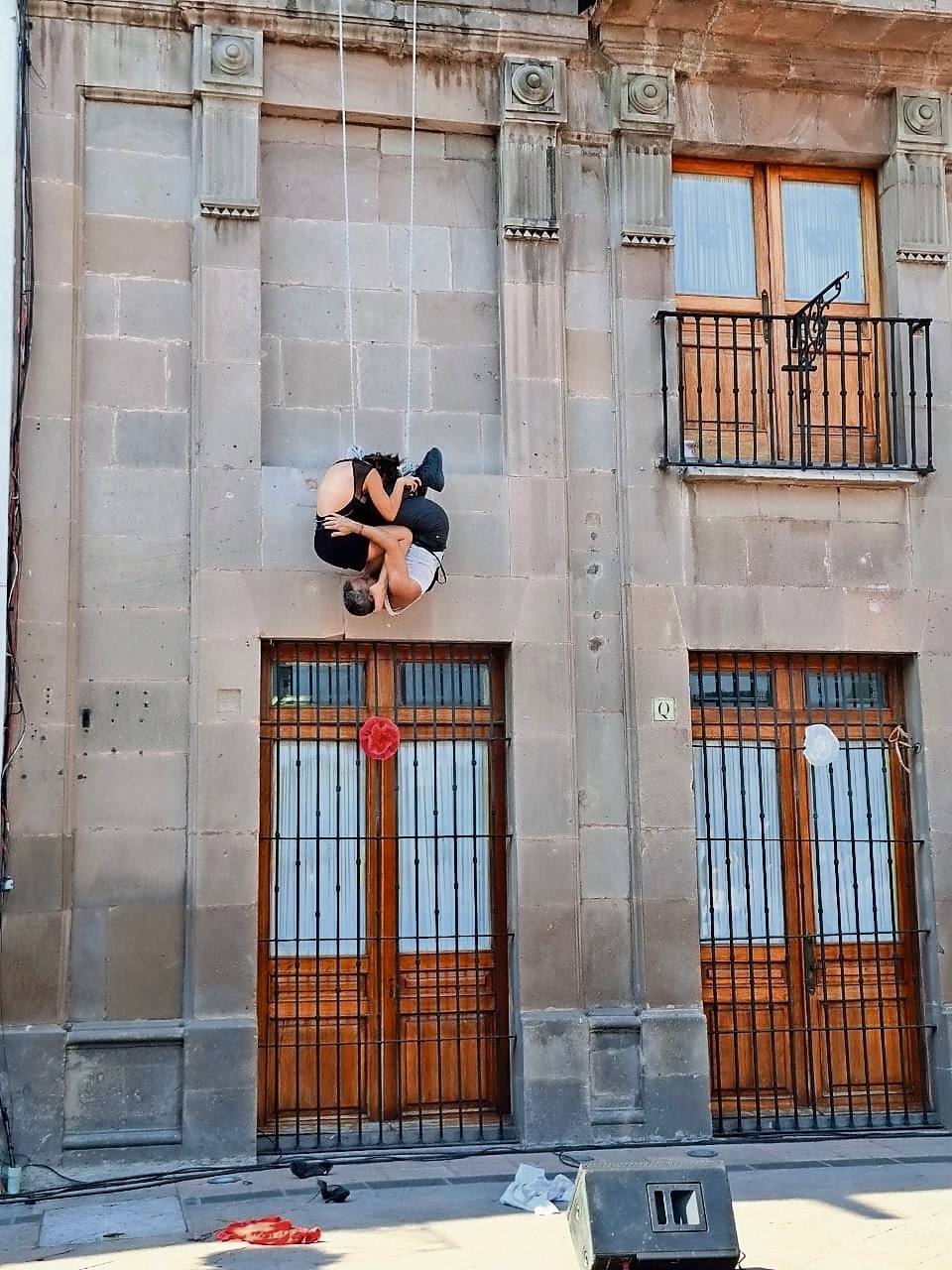 Una pareja aparece en lo alto del antiguo edificio de la Delegación Centro Histórico de Querétaro, y poco a poco empiezan a descender, sujetados de los pies, en una serie de movimientos que emulan un baile. La pareja es Pablo Cuello (Argentina) y Camila Manzano (España), de la compañía de danza áerea Subcielo que tiene sede en España. En la música los acompañó Roberto Morales, chelista originario de Chile y radicado en Querétaro desde hace varios años. Célula es el nombre del espectáculo que presentaron por única vez en la ciudad, como una muestra de lo que se verá en el Querétaro Experimental 2024.